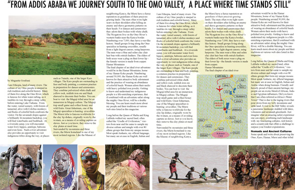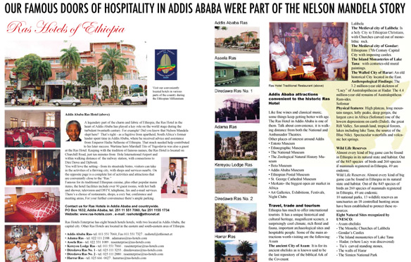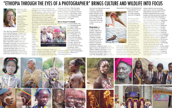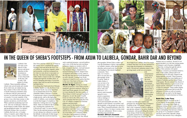 Click above for download. Preview pages from Africa Travel Magazine's Ethiopia Millennium Souvenir Edition, appearing in print January 2008.. Above photos by Robert Eilets, Muguette Goufrani and Angela Fairbank. |