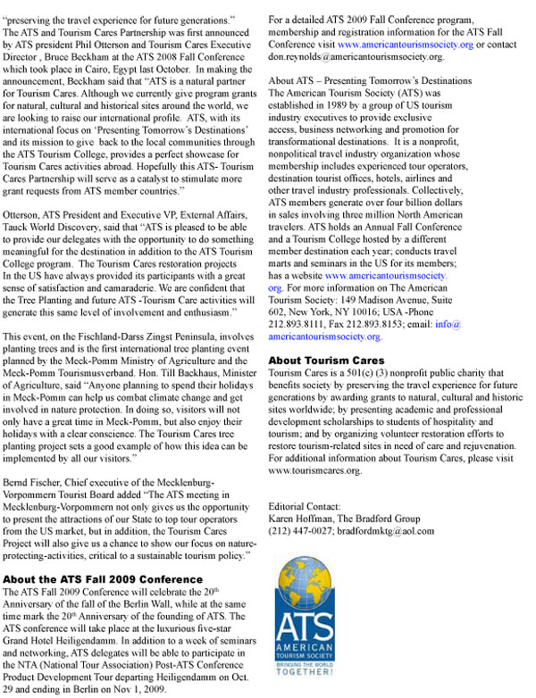 Phil Otterson, President, American Tourism Society (ATS), announced that the ATS Fall 2010 Conference will be held in Pristina, Kosovo's Capital, from October 25-27, 2010. This ATS-organized event In Kosovo, which only gained its independence in February 28, 2008, will be the first-ever tourism conference to be held in the newborn country. "Kosovo is a perfect example of what ATS's mission is about," said Otterson, "assisting transformational destinations with tourism marketing skills, training through the onsite ATS tourism college program, and educating ATS members about the newest destinations. Now, ATS contributions to the host country have been further strengthened through our recent partnerships with National Tour Association (NTA) and Tourism Cares." ATS is using the platform of the USTOA Annual Conference and Marketplace in Banff, Canada, December 8-10, 2009, to roll out the promotional campaign for this historic event. The official ATS announcement follows the formal invitation made by Kosovo host, Bujar Kuji, Director, the Republic of Kosovo Ministry of Trade and Industry Department of Tourism, at the closing of the recent ATS Fall 2009 conference held in Mecklenburg-Vorpommern, Germany. At the ATS 2010 Fall Conference, NTA will co-sponsor the post-conference new product development tour to Southern Kosovo and Tirana, Albania, October 28-31; and Tourism Cares will organize as part of the ATS program, its second annual local community service project for ATS delegates. The ATS Tourism College, which has received accolades from past host country tourism professionals, university professors and students alike, will involve local university students in special sessions and as invited guests to the ATS conference. About ATS &endash; Presenting Tomorrow's Destinations The American Tourism Society (ATS) was established in 1989 by a group of US tourism industry executives to provide exclusive access, business networking and promotion for transformational destinations. It is a nonprofit, nonpolitical travel industry organization whose membership includes experienced tour operators, destination tourist offices, hotels, airlines and other travel industry professionals. Collectively, ATS members generate over four billion dollars in sales involving three million North American travelers. ATS holds an Annual Fall Conference and a Tourism College hosted by a different member destination each year; conducts travel marts and seminars in the US for its members; has a website www.americantourismsociety.org. For more information on The American Tourism Society: 149 Madison Avenue, Suite 602, New York, NY 10016; USA -Phone 212.893.8111, Fax 212.893.8153; email: info@americantourismsociety.org. Editorial Contact: Karen Hoffman, The Bradford Group (212) 447-0027; bradfordmktg@aol.com |
